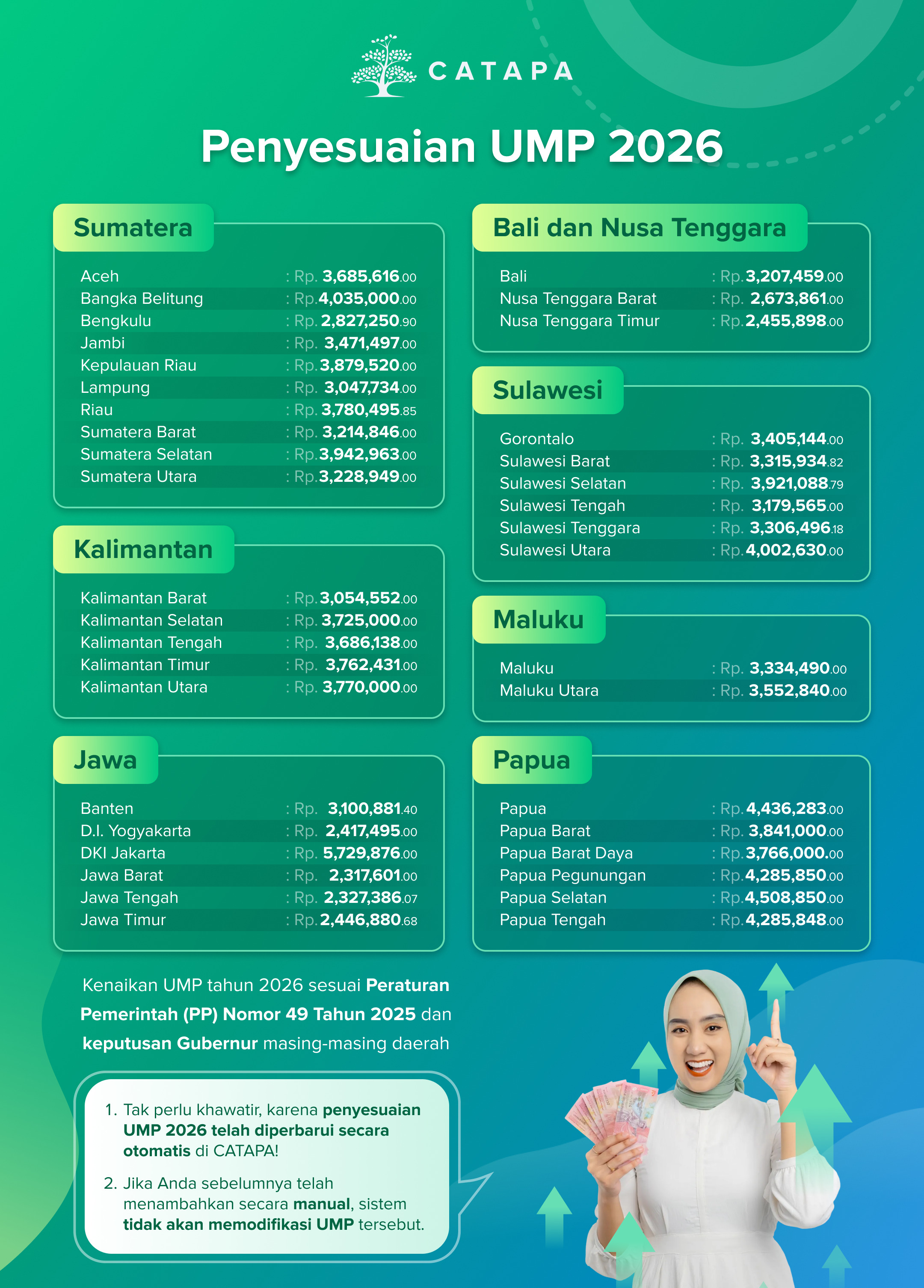 Bagi pengguna CATAPA, Anda tak perlu khawatir, karena CATAPA akan melakukan update besaran UMP Master (UMP 2026) mengikuti besaran yang tercantum dalam SK Gubernur setiap daerah.